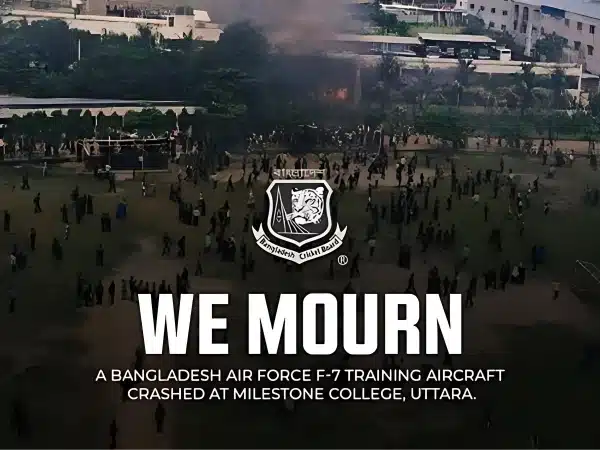 گزشتہ روز بنگلہ دیش ایئرفورس کا تربیتی طیارہ دارالحکومت ڈھاکا میں ایک اسکول اور کالج کمپلیکس پر گر کر تباہ ہو گیا تھا، حادثے میں کم از کم 20 افراد جاں بحق جبکہ 171 زخمی ہوئے، جس کے بعد بنگلہ دیش بھر میں آج یوم سوگ منایا جا رہا ہے۔