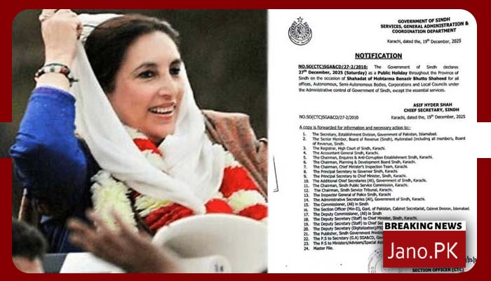 کراچی (جانوڈاٹ پی کے) حکومتِ سندھ نے ہفتہ 27 دسمبر 2025ء کو سابق وزیرِ اعظم اور پیپلز پارٹی کی چیئرپرسن بینظیر بھٹو کے یومِ شہادت پر سندھ میں عام تعطیل کا اعلان کر دیا۔