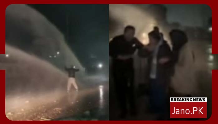 اچانک یخ بستہ پانی کے پریشر سے شرکاء سڑک چھوڑ کر پیچھے خالی پلاٹ کی جانب منتقل ہوگئے، جبکہ بانی چیئرمین کی تینوں بہنیں بھی پانی سے مکمل طور پر بھیگ گئیں۔