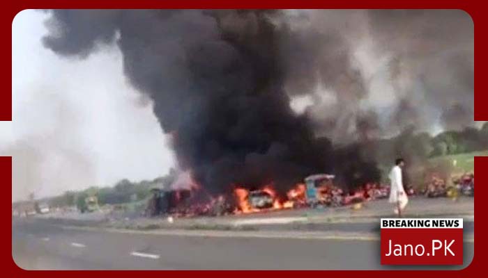 ریسکیو حکام کے مطابق کوئلے سے بھرے ٹرک اور آئل ٹینکر میں اچانک آگ لگنے سے 16 افراد زخمی ہو گئے، زخمیوں میں فائر بریگیڈ کا عملہ، ڈرائیور اور پولیس اہلکار بھی شامل ہیں۔