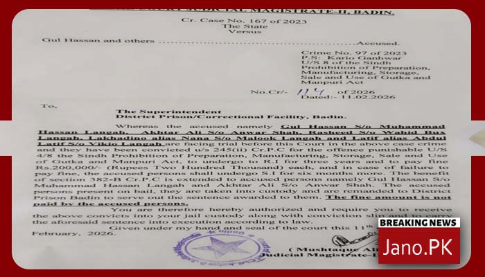 بدین (رپورٹ مرتضیٰ میمن/جانو ڈاٹ پی کے)سول جج و جوڈیشل مجسٹریٹ ٹو بدین کی عدالت نے پانچ ملزمان پر جرم ثابت ہونے پر تین تین سال قید دو دو لاکھ روپے جرمانے کی سزا سنادی تفصیل کے مطابق سول جج و جوڈیشل مجسٹریٹ ٹو بدین مشتاق علی مہیسر کی عدالت میں زیر سماعت مقدمہ نمبر167/2023 میں نامزد ملزمان گل حسن لانگاہ اختر علی شاہ رشید لانگاہ لکھاڈنو عرف نانا عبد الطیف عرف لطیف پر منشیات گھٹکہ مین پڑی بنانے اور فروخت کرنے کا جرم ثابت ہونے پر پانچوں ملزمان کو تین تین سال قید اور دو دو لاکھ روپے جرمانے کی سزا سنائی ہے جرمانے کی رقم کی عدم ادائیگی پر تمام ملزمان کو مزید چھ چھ ماہ قید کاٹنی ہوگی سزا پانے والے ملزمان پر تحصیل گولاڑچی کے شہر کڑیو گھنور تھانے پر منشیات ایکٹ کے تحت 2023 میں مقدمہ درج کیا گیا تھا عدالتی فیصلے کے بعد تمام ملزمان کو ڈسٹرکٹ جیل بدین بھیج دیا گیا
