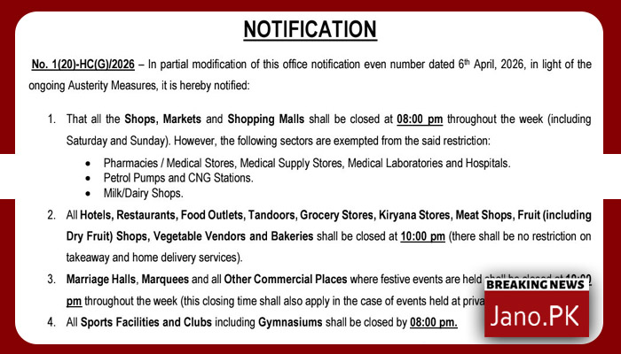 انتظامیہ کے مطابق شادی ہالز، مارکیز اور کمرشل ایونٹ وینیوز بھی رات10بجے بند کرنے کے پابند ہوں گے، جبکہ اسپورٹس فیسلٹیز اور جمز کو رات 8 بجے بند کرنا ہوگا۔ یہ احکامات 16 اپریل 2026 سے فوری طور پر نافذ العمل ہوں گے اور آئندہ حکم نامے تک برقرار رہیں گے۔