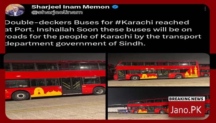 سندھ کے سینئر وزیر شرجیل انعام میمن کی جانب سے ایکس پر جاری پیغام میں بتایا گیا کہ کراچی کے عوام کے لئے بڑی خوشخبری، ڈبل ڈیکر بسیں بندر گاہ پہنچ گئیں جو انشااللہ جلد سڑکوں پر آئیں گی