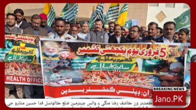 ڈہرکی: (رپورٹر: وجے کمار چاولہ/جانو ڈاٹ پی کے)حکومتِ سندھ کی ہدایات پر ضلع گھوٹکی بھر میں یومِ کشمیر جوش و جذبے کے ساتھ منایا گیا۔ اس موقع پر مختلف شہروں میں ریلیاں نکالی گئیں اور بھارت کے غیر قانونی قبضے، ظلم و جبر اور مقبوضہ کشمیر میں انسانی حقوق کی سنگین خلاف ورزیوں کے خلاف احتجاج کیا گیا۔
