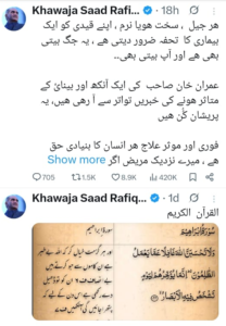 اس موقع پر انکے دورحکومت میں سیاسی مخالفین سے بدسلوکی کے واقعات دھرانا اعلٰی ظرفی نہیں ھوگا۔خواجہ سعد رفیق نے مزید کہا کہ حکومت اور ریاستی اداروں کی ذمہ داری ہے۔عمران خان صاحب کی علالت کے حوالہ سے میڈیکل رپورٹس کی بنیاد پر سرکاری موقف جاری کیا جاۓ،عمران خان صاحب کے اھل خانہ سے انکی ملاقات کروائ جاۓ،انکی منشا کے مطابق ڈاکٹرز کو ان تک رسائ دی جاۓ،انکے بہترین علاج کیلئے تمام ممکن اقدامات کئے جائیں۔