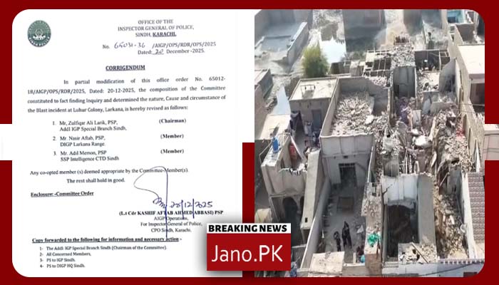 لاڑکانہ (رپورٹ: احسان جونیجو/نمائندہ جانو ڈاٹ پی کے) لاڑکانہ کی لہر کالونی میں 4 روز قبل گھر کے اندر ہونے والے زوردار دھماکے کی تحقیقات کے لئے آئی جی سندھ پولیس نے ایڈیشنل آئی جی اسپیشل برانچ سندھ ذوالفقار علی لاڑک کی سربراہی میں تین رکنی کمیٹی تشکیل دے دی گئی ہے. اے آئی جی آپریشنز لیفٹیننٹ کمانڈر کاشف آفتاب احمد عباسی کی جانب سے جاری کردہ نوٹیفکیشن کے مطابق کمیٹی میں ڈی آئی جی لاڑکانہ ناصر آفتاب اور ایس ایس پی انٹیلیجنس سی ٹی ڈی سندھ عادل میمن کو شامل کیا گیا ہے.