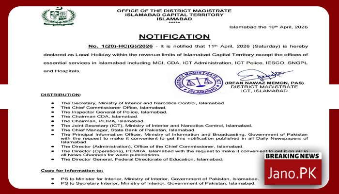 اسلام آباد (جانوڈاٹ پی کے) ضلعی انتظامیہ اسلام آباد نے ہفتہ 11 اپریل 2026 کو وفاقی دارالحکومت کی ریونیو حدود کے اندر لوکل ہالیڈے کا اعلان کر دیا ہے۔