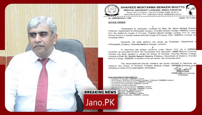 چانڈکا میڈیکل کالج لاڑکانہ کے پرنسپل پروفیسر ضمیر احمد سومرو کا استعفیٰ منظور