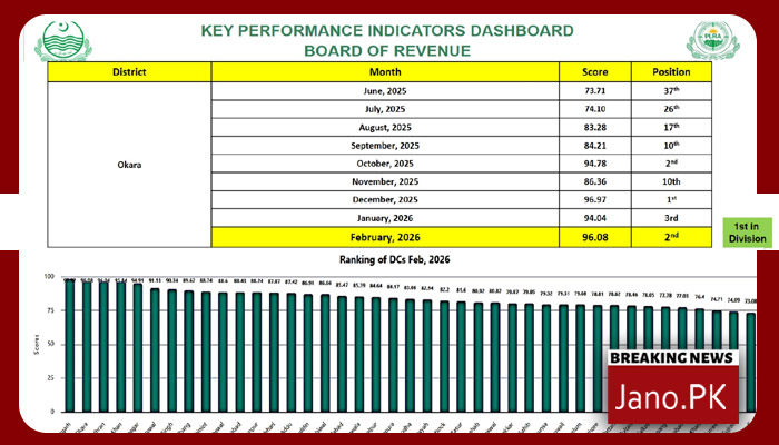 اوکاڑہ(رپورٹ:وحیدآرائیں/ جانوڈاٹ پی کے)ڈپٹی کمشنر احمد عثمان جاوید کی قیادت میں ریونیو ٹیم کی کامیابیوں کا تسلسل برقرار،ایڈیشنل ڈپٹی کمشنر ریونیو محمد شعجین وسطرو کی زیر نگرانی ریونیو ٹیم کی شاندار کارکردگی کا سلسلہ جاری ہے، بورڈ آف ریونیو ماہ فروری کی رینکنگ میں پنجاب بھر میں ضلع اوکاڑہ دوسری پوزیشن پر براجمان ہوگیا، پنجاب بھر میں ضلع اوکاڑہ نے 96.08 سکورز کے حصول سے دوسری پوزیشن حاصل کر لی۔