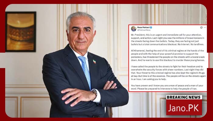 رضا پہلوی نے سوشل میڈیا پر اپنے پیغام میں لکھا کہ ’جناب صدر، یہ آپ کی فوری توجہ، حمایت اور عملی اقدام کے لیے ایک ہنگامی اپیل ہے۔ براہِ کرم ایران کے عوام کی مدد کے لیے مداخلت کے لیے تیار رہیں‘۔