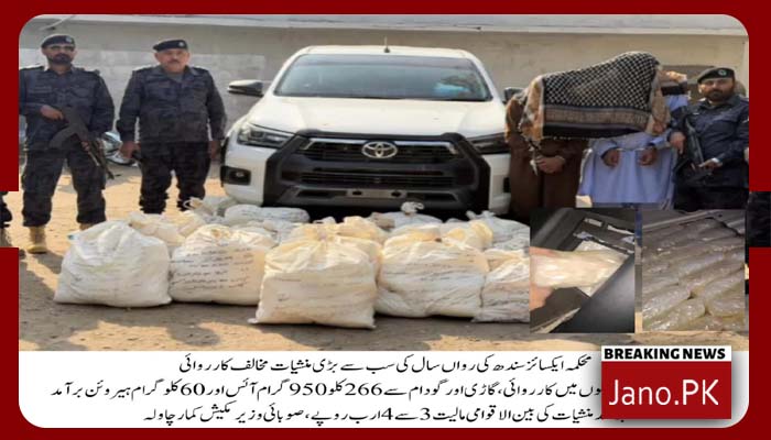 سکھر(جانوڈاٹ پی کے)محکمہ ایکسائز، ٹیکسیشن و نارکوٹکس کنٹرول سندھ نے رواں سال کی سب سے بڑی منشیات مخالف کارروائی کرتے ہوئے منشیات کی ایک بڑی اسمگلنگ ناکام بنا دی۔ خفیہ اطلاع پر کی گئی اس کارروائی کے دوران گاڑی اور گودام سے مجموعی طور پر 266 کلو 950 گرام آئس اور 60 کلوگرام ہیروئن برآمد کی گئی، جس کی بین الاقوامی مارکیٹ میں مالیت 3 سے 4 ارب روپے بتائی جا رہی ہے۔