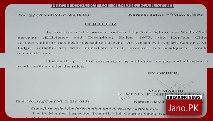 بدین(رپورٹ مرتضیٰ میمن/جانو ڈاٹ پی کے)سندھ ہائی کورٹ کا بڑا ایکشن سینئر سول جج احسان علی انصاری معطل سندھ ہائی کورٹ کی انسپکشن کمیٹی کے رکن آصف مجید کے دستخط سے جاری حکم نامے کے مطابق کارروائی سندھ سول سرونٹس (ایفیشنسی اینڈ ڈسپلن) رولز 1973 کے تحت عمل میں لائی گئی اور حکم نامہ چیف جسٹس سندھ ہائی کورٹ کی منظوری سے جاری کیا گیا