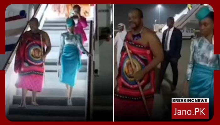 ویڈیو میں بادشاہ مسواتی کو روایتی لباس میں ملبوس پرائیویٹ جیٹ سے اترتے ہوئے دیکھا جاسکتا ہے جبکہ ان کے پیچھے خوبصورت لباس میں ملبوس خواتین کا ایک گروپ بھی تھا۔