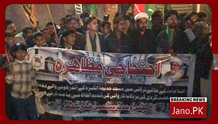 سکھر(بیورورپورٹ)مجلس وحدت مسلمین پاکستان ضلع سکھر کے زیرِ اہتمام اسلام آباد کی مسجد خدیجتہ الکبریٰؑ (ترلائی) میں پیش آنے والے دہشتگردی کے المناک واقعے کے خلاف سکھر پریس کلب کے سامنے ایک بھرپور احتجاجی مظاہرہ کیا گیا۔ مظاہرے میں شہداء کی یاد میں شمعیں روشن کی گئیں جبکہ دہشتگردی، فرقہ واریت اور تکفیری سوچ کے خلاف شدید نعرے بازی کی گئی۔احتجاجی مظاہرے میں علمائے کرام، ڈاکٹرز، وکلاء، طلبہ، تاجر برادری سمیت بزرگوں، خواتین اور بچوں کی بڑی تعداد نے شرکت کی۔ شرکاء نے ہاتھوں میں پلے کارڈز اور بینرز اٹھا رکھے تھے جن پر دہشتگردی کے خاتمے، عبادت گاہوں کے تحفظ اور بے گناہ نمازیوں کے قتل کے خلاف سخت مطالبات درج تھے۔