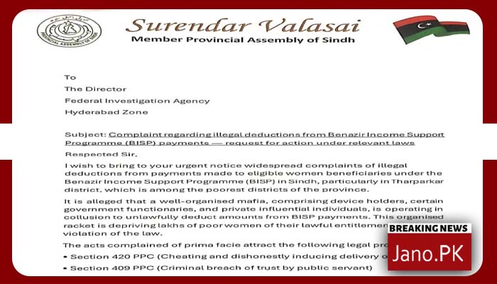 ایم پی اے سندھ سریندر ولاسائی نے بی آئی ایس پی کے تحت غریب خواتین سے کی جانے والی ناجائز کٹوتیوں کے خلاف ایف آئی اے حیدرآباد زون کے ڈائریکٹر سید وسیم حیدر کو باقاعدہ تفصیلی خط ارسال کیا ہے۔