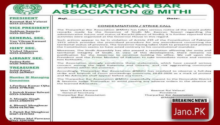 لہٰذا تھرپارکر بار ایسوسی ایشن مٹھی نے بطور احتجاج کل 24-02-2026 کو مکمل ہڑتال اور عدالتی کارروائیوں کے بائیکاٹ کا فیصلہ کیا ہے اور کوئی بھی وکیل کسی عدالت میں پیش نہیں ہوگا۔